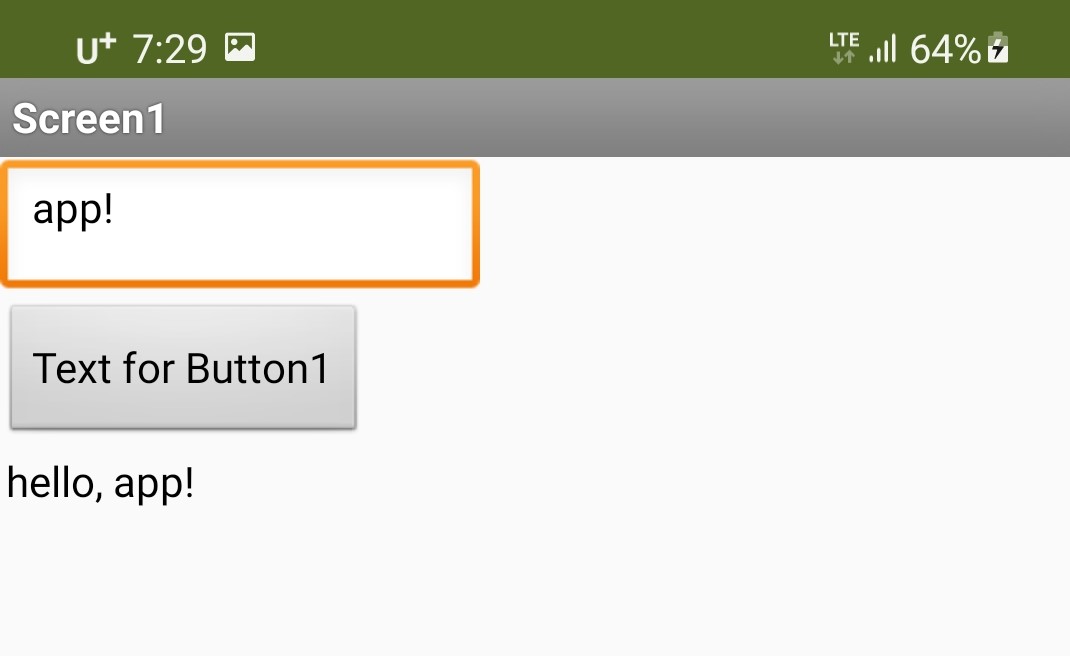 버튼을 클릭하면 밑의 라벨에 "hello, "를 앞에 붙여서 출력해주는 간단한 앱입니다.